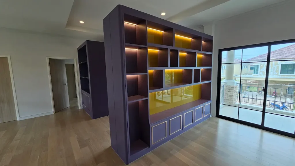 ติดตั้งชิ้นงานชั้นทีวี ตู้โชว์ ลามิเนตลายหินอ่อน